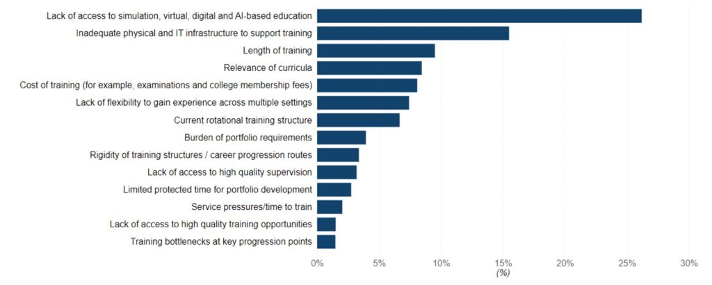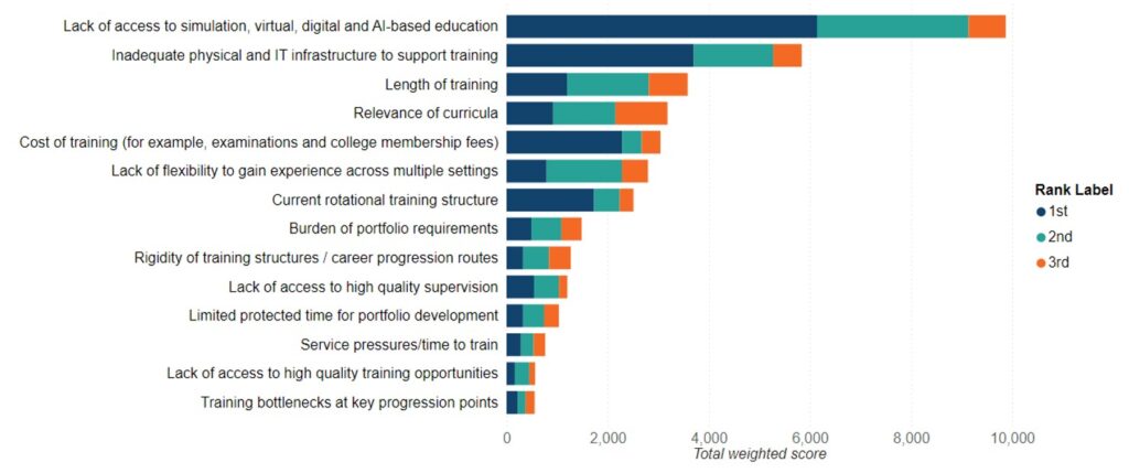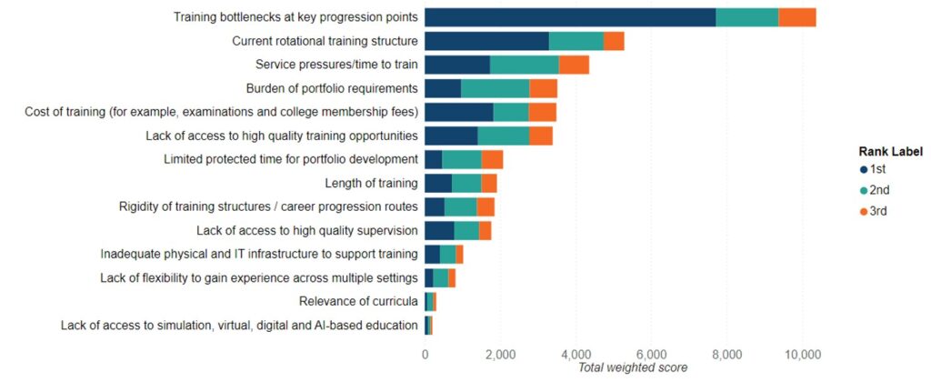‘Training bottlenecks at key progression points’ was considered the most significant barrier by a considerable margin, with 26% of the total votes after weighting (n=10,367). This was followed by the ‘current rotational training structure’, with 13% (n=5,284) and ‘service pressures/time to train’, with 11% (n=4,354). The ‘burden of portfolio requirements’, ‘cost of training’ and ‘lack of access to high quality training opportunities’ were also highlighted as issues, each receiving 8–9% of votes after weighting.
