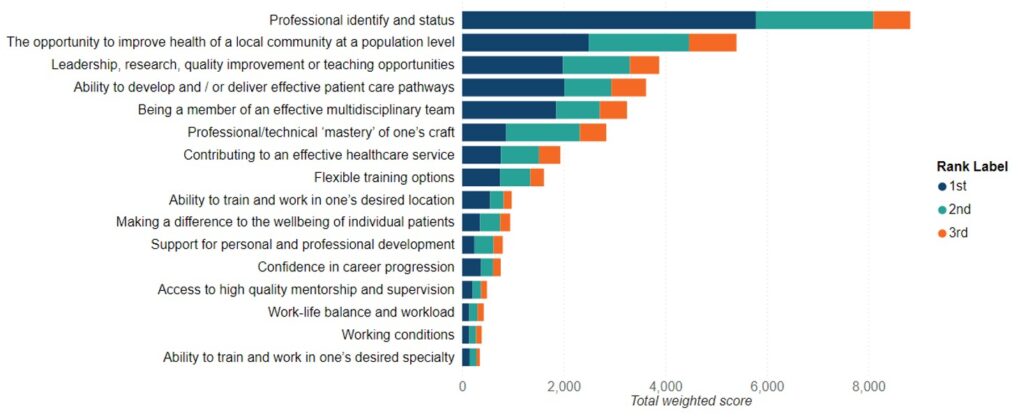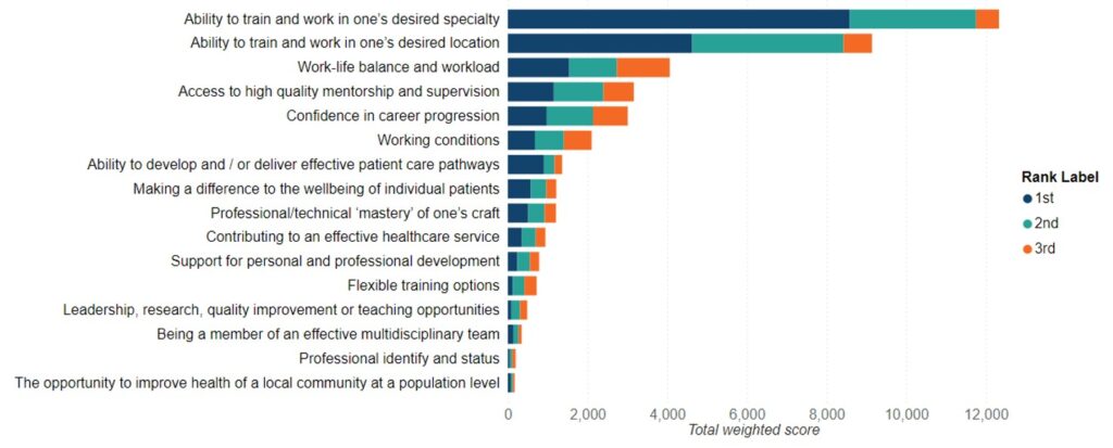‘Ability to train and work in one’s desired specialty’ was deemed to be the most important factor influencing satisfaction by a margin of 3,188 after weighting. This was the factor most commonly ranked first, with 2,860 selecting this option, and the second most commonly ranked second.