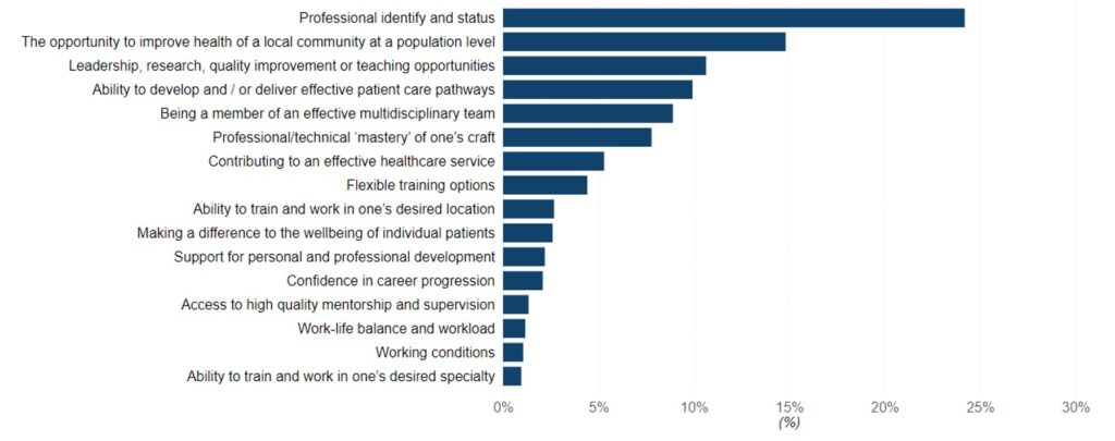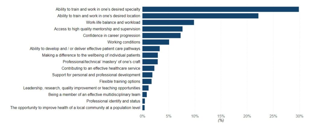 ‘Ability to train and work in one’s desired location’ was the second most important factor, followed by ‘work–life balance and workload’. ‘Access to high quality mentorship and supervision’ and ‘confidence in career progression’ were also selected as significant factors impacting on satisfaction.