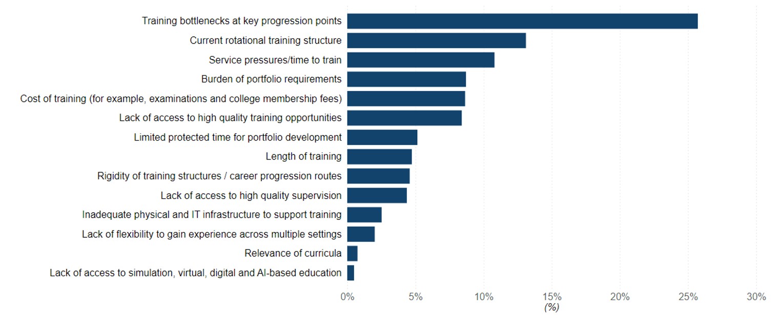 ‘Training bottlenecks at key progression points’ was considered the most significant barrier by a considerable margin, with 26% of the total votes after weighting (n=10,367). This was followed by the ‘current rotational training structure’, with 13% (n=5,284) and ‘service pressures/time to train’, with 11% (n=4,354). The ‘burden of portfolio requirements’, ‘cost of training’ and ‘lack of access to high quality training opportunities’ were also highlighted as issues, each receiving 8–9% of votes after weighting.