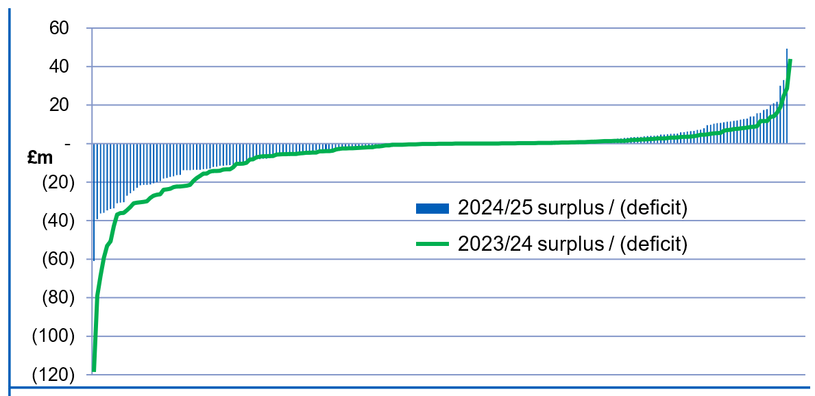 Figure 1 shows the distribution of providers’ surplus or deficit for 2024/25 and 2023/24. The two lines are plotted independently.