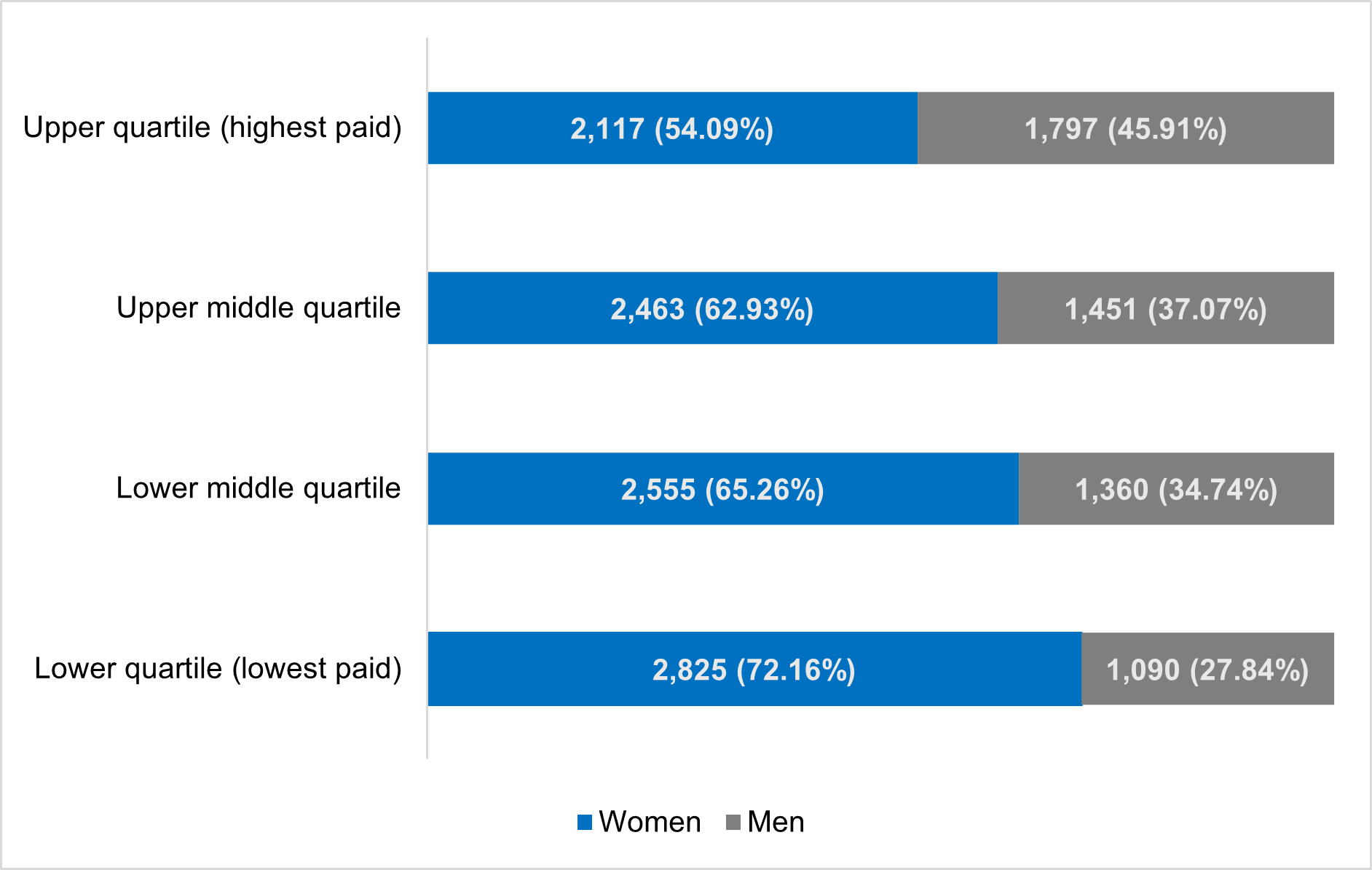 Figure 1: The actual numbers and proportion of men and women in each pay quartile on 31 March 2025