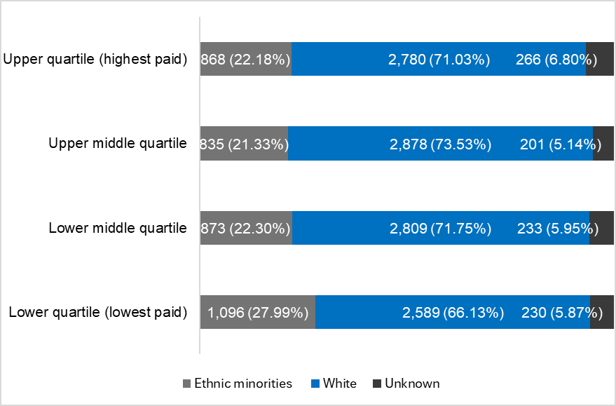 - upper quartile (highest paid): 868 ethnic minority staff (22.18%), 2,780 White staff (71.03%) and 266 staff with unknown ethnicity (6.80%)