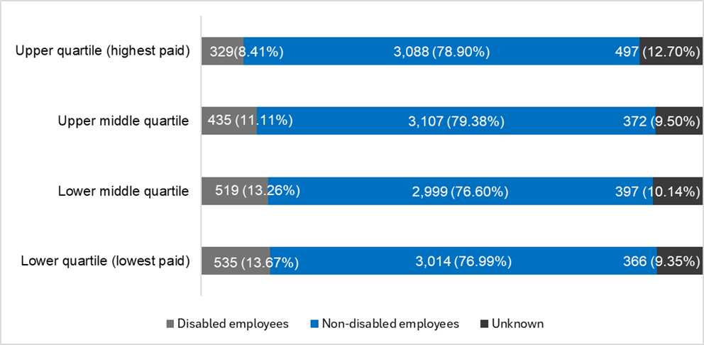 - a high number of new joiners: Most of recorded themselves as non‑disabled (788) rather than disabled (97). This changed the overall pay picture because the non‑disabled group grew faster than the disabled group