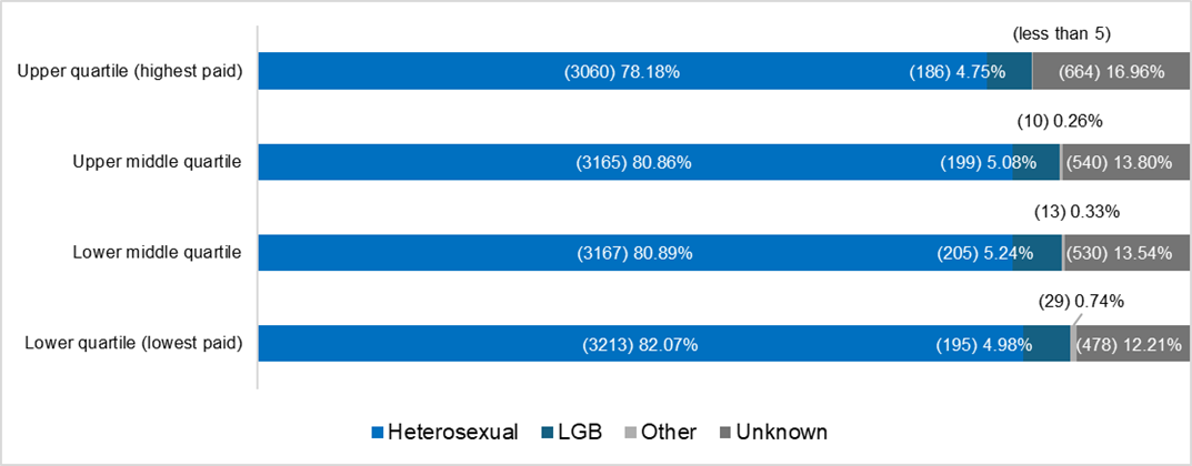 - upper middle quartile: 199 LGB staff (5.08%), 3,165 heterosexual staff (80.86%), 10 (0.26%) staff recorded as other sexual orientations and 540 staff with unknown status (13.80%)