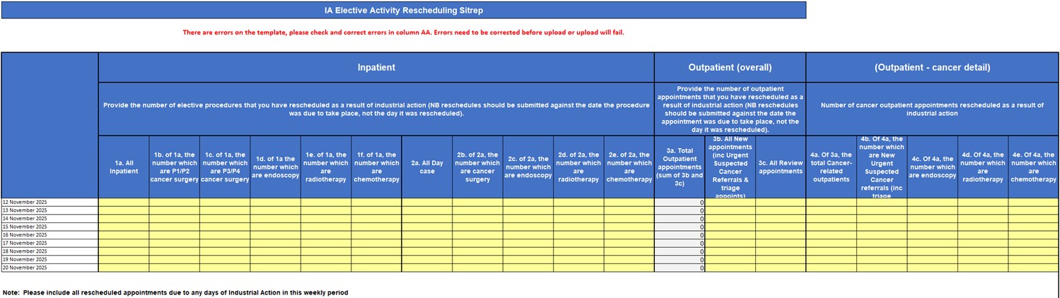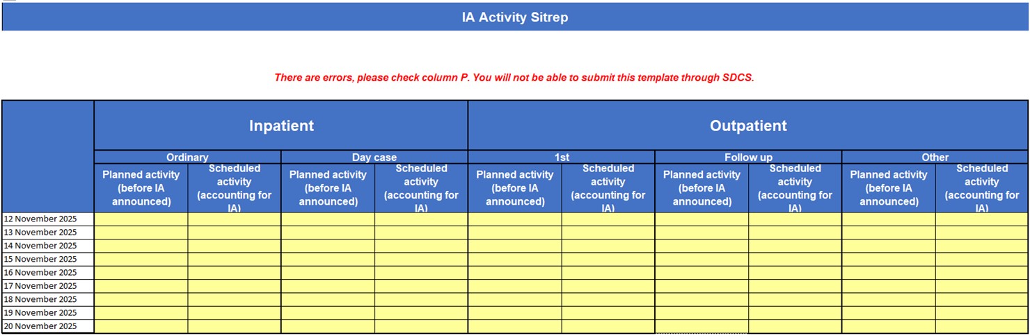 This is a new sitrep that will be collected from acute trusts on Tuesday 11 November 2025 and will collect planned activity (run rates) and scheduled activity (accounting for industrial action) for inpatient and outpatient activity for each day of the period 12 November to 20 November 2025. This data will be used to show the extent to which providers are planning to maintain elective activity to the fullest possible extent during industrial action. The collection will open at 9am on Tuesday 11 November 2025 and the deadline for submission is 4pm the same day. The template will be available to download from SDCS from 9am on the day the collection is running.