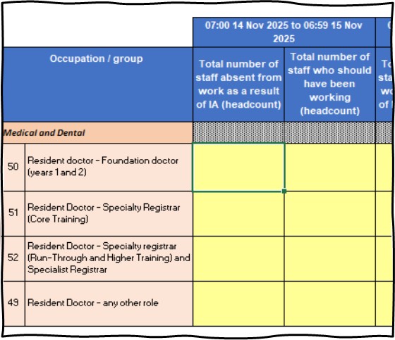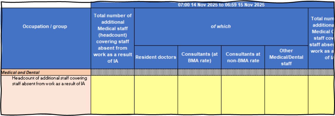 This will collect numbers of staff taking part in the industrial action and the total numbers of staff due to be at work. This data will be collected once and will open at 9am on Wednesday 19 November and close at 1am on Thursday 20 November. The template will be available to download from SDCS from 9am on the 1st day the collection is running. A screenshot of the template for this can be found in Annex C. Please note the new requirement to distinguish between different resident doctor grades and plan to capture this information in advance.