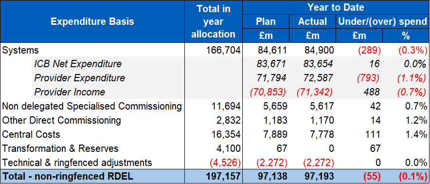 1. The NHS is broadly balanced at month 6 with a revenue (non-ringfenced RDEL) position to the end of September 2025 of £55m overspend (0.1% of YTD allocation).