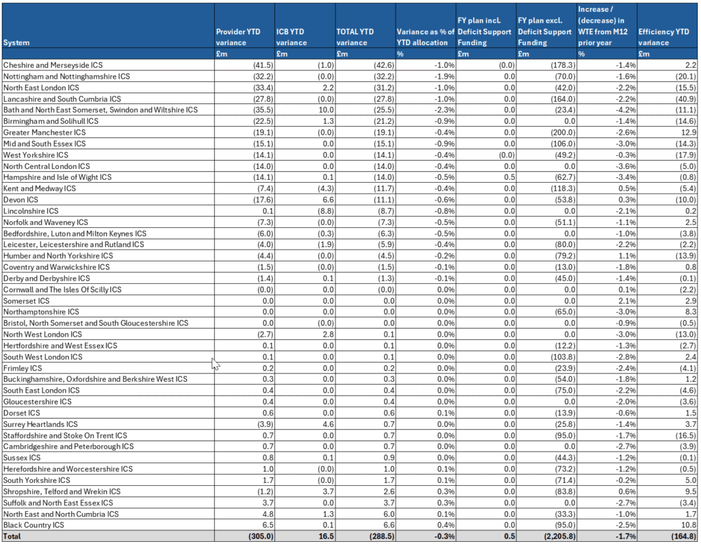 2. The month 6 year to date (YTD) financial position is driven by overspends in systems of £289m, which includes some of the impact of industrial action, and reflects held-back deficit support funding. Adjusting for these items, the system position is closer to breakeven in aggregate.