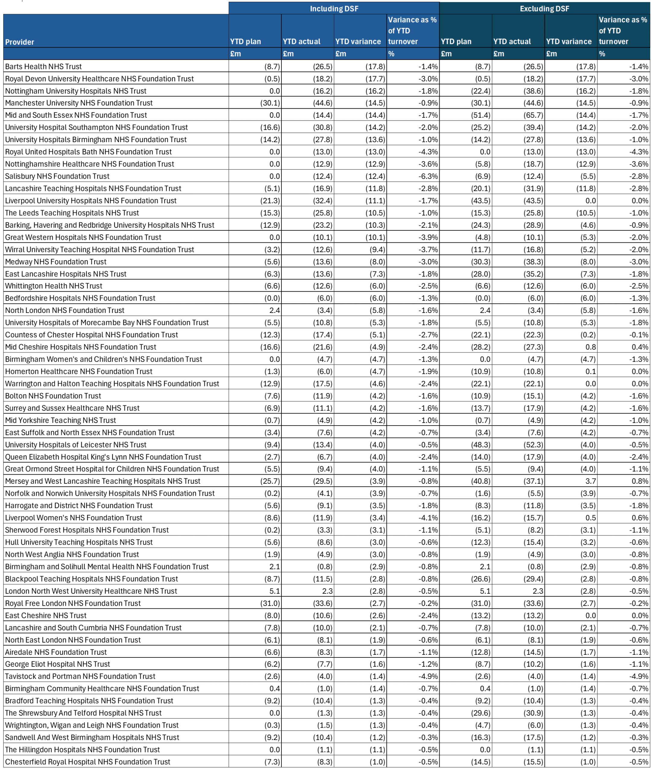 5. Total Deficit Support Funding (DSF) held back YTD totals £67m – this relates to 3 systems, one of which also had funding held back at Quarter 1. Adjusting for the lost DSF and the financial impact of industrial action would bring the aggregate year to date system position even closer to plan.