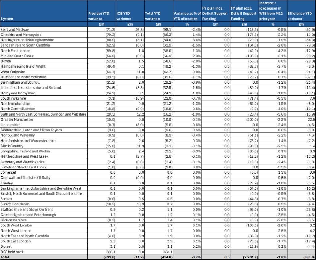 2. The month 9 YTD financial position is driven by overspends in systems of £445m. This figure reflects the impact of held-back deficit support funding (DSF).