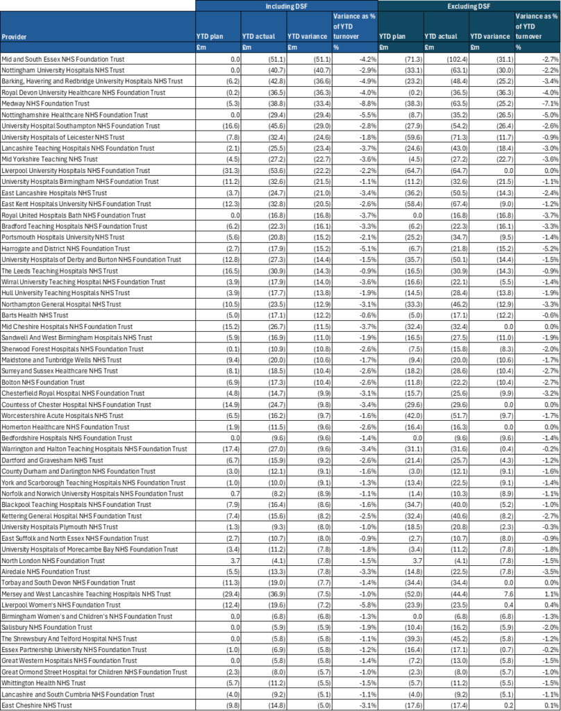 5. Following a review of the Month 9 financial position, 13 systems will not currently receive DSF in the final quarter of the year and, without remedial action, will therefore end the year with an overspend. Several of these systems (2 ICBs and 21 trusts), which have been behind their planned financial performance during the year, are now formally forecasting a year-end overspend. Systems that revised their forecasts at Month 9 have been contacted and asked to work closely with Regional Teams to identify further actions this year to improve the reported position and reduce the run-rate carried into 2026/27. It is recognised that the more efficiencies and cost reductions that can be brought forward and accelerated this year, the stronger the starting position will be next year. Where a trust is unable to deliver its 2025/26 plan and has forfeited deficit support funding, confirmation has been requested that the Board is fully briefed on the implications.