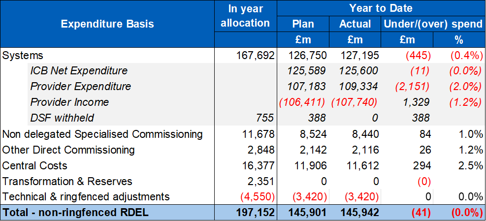 1. The NHS remains broadly balanced at month 9 with a revenue (non-ringfenced RDEL) position to the end of December 2025 showing a £41m overspend (0.03% of year to date (YTD) allocation).