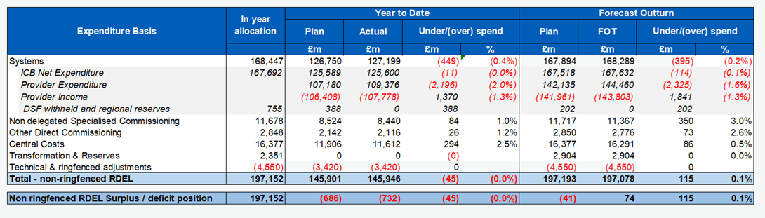 1. The NHS remains broadly balanced at month 9 with a revenue (non-ringfenced RDEL) position to the end of December 2025 showing a £41m overspend (0.03% of year to date (YTD) allocation).