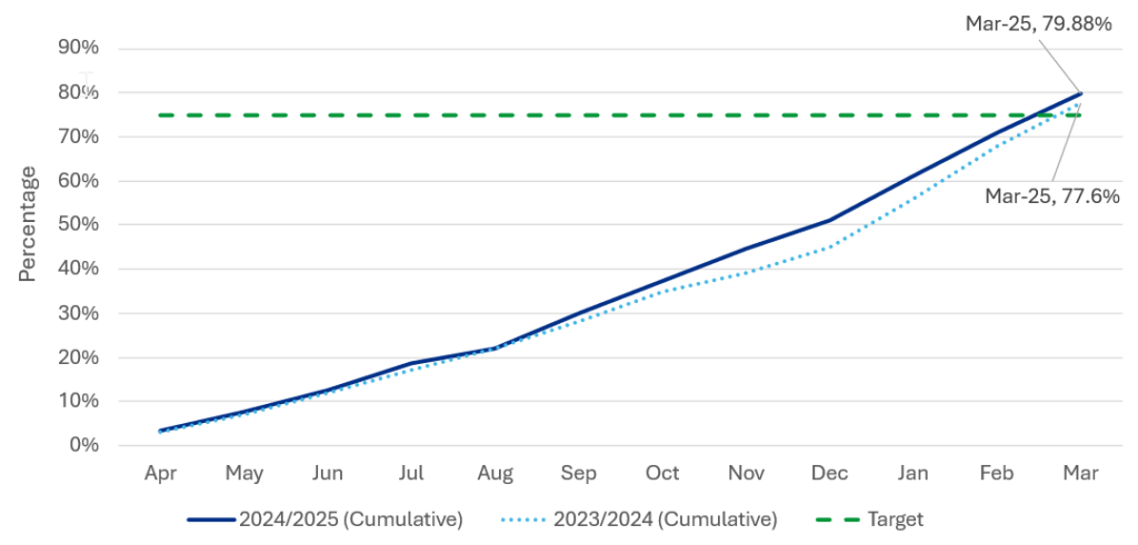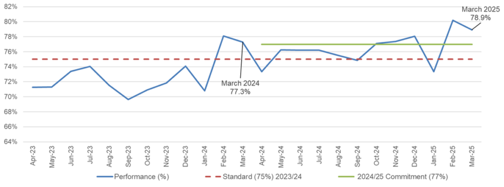 Improvement of A&E waiting times, compared to 2023/24, with a minimum of 78% of patients seen within 4 hours in March 2025 |
