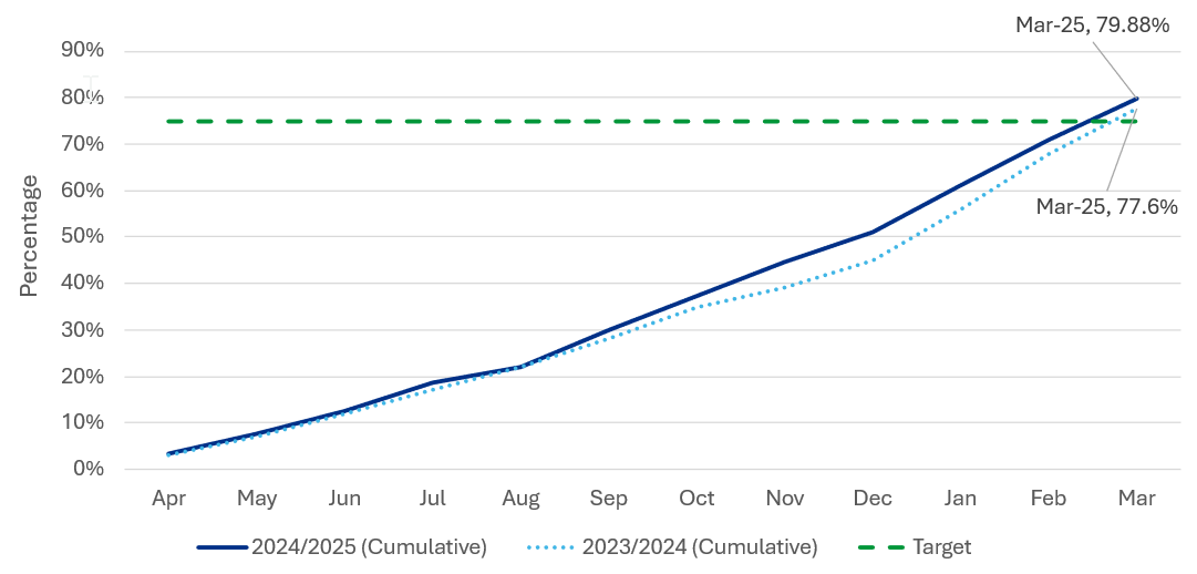 Improvement of A&E waiting times, compared to 2023/24, with a minimum of 78% of patients seen within 4 hours in March 2025 |