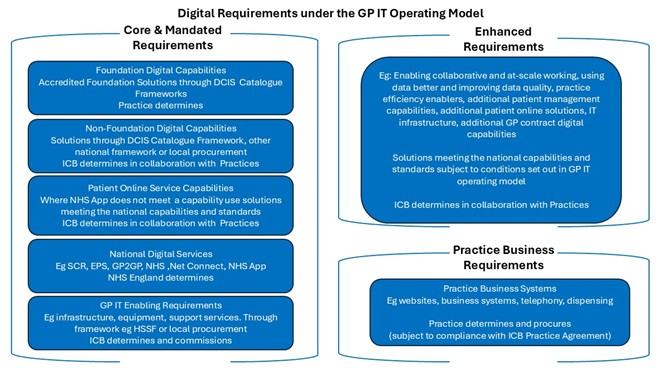 - mandates a number of digital requirements which must be provided by the NHS to meet obligations under the ICB practice agreement and the GP contract