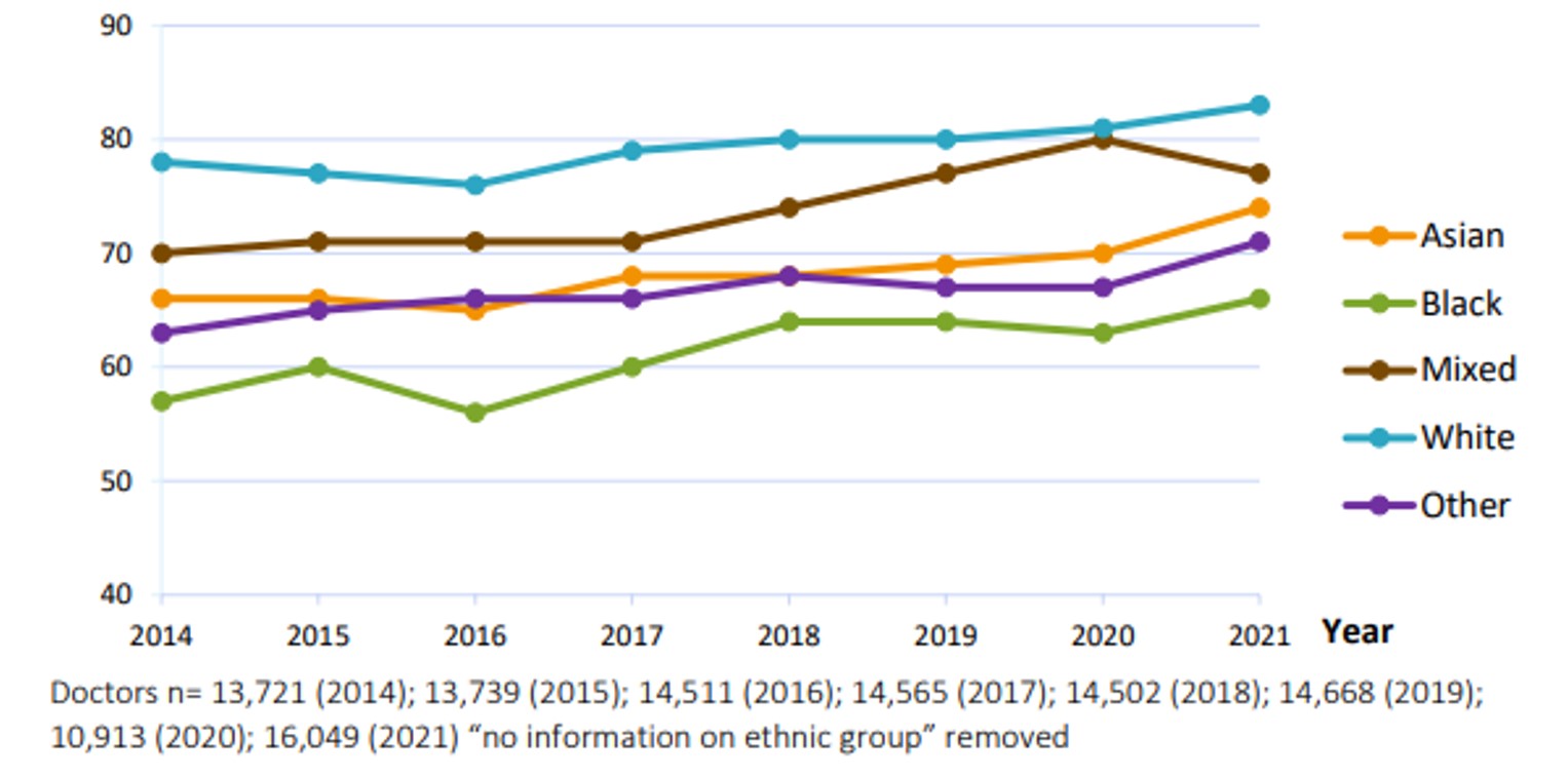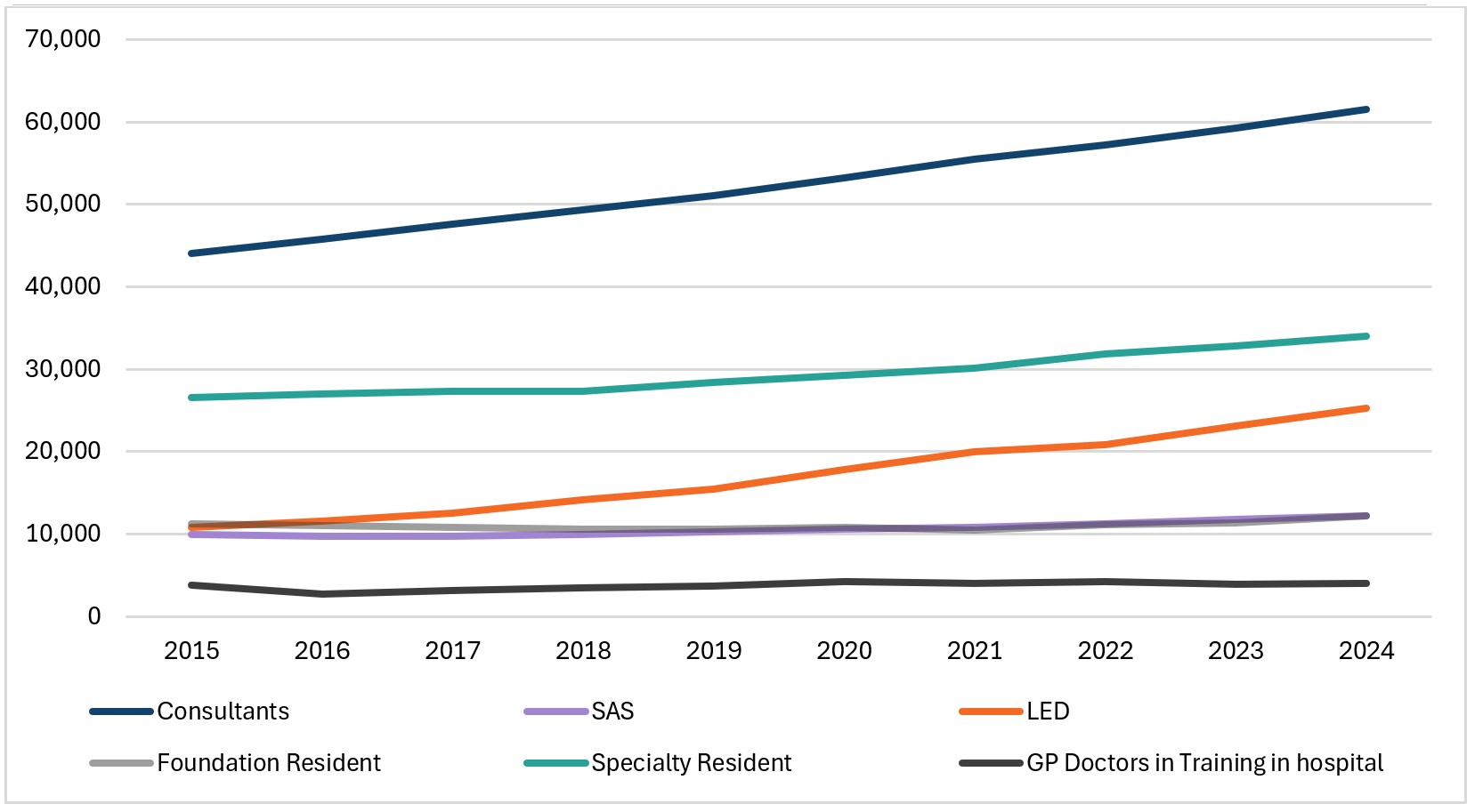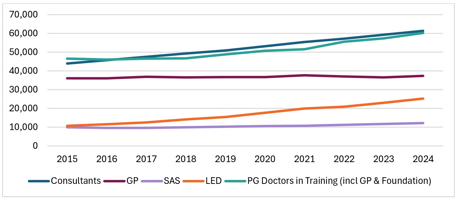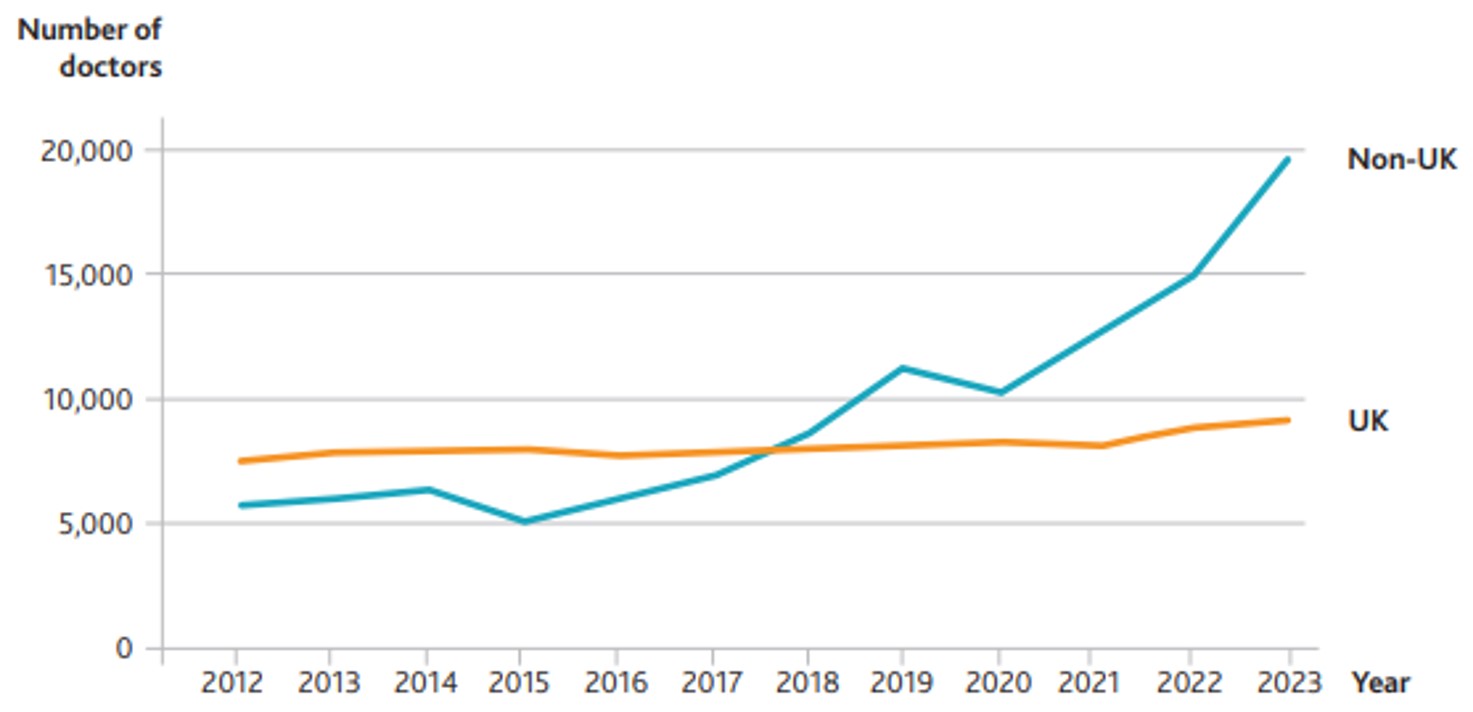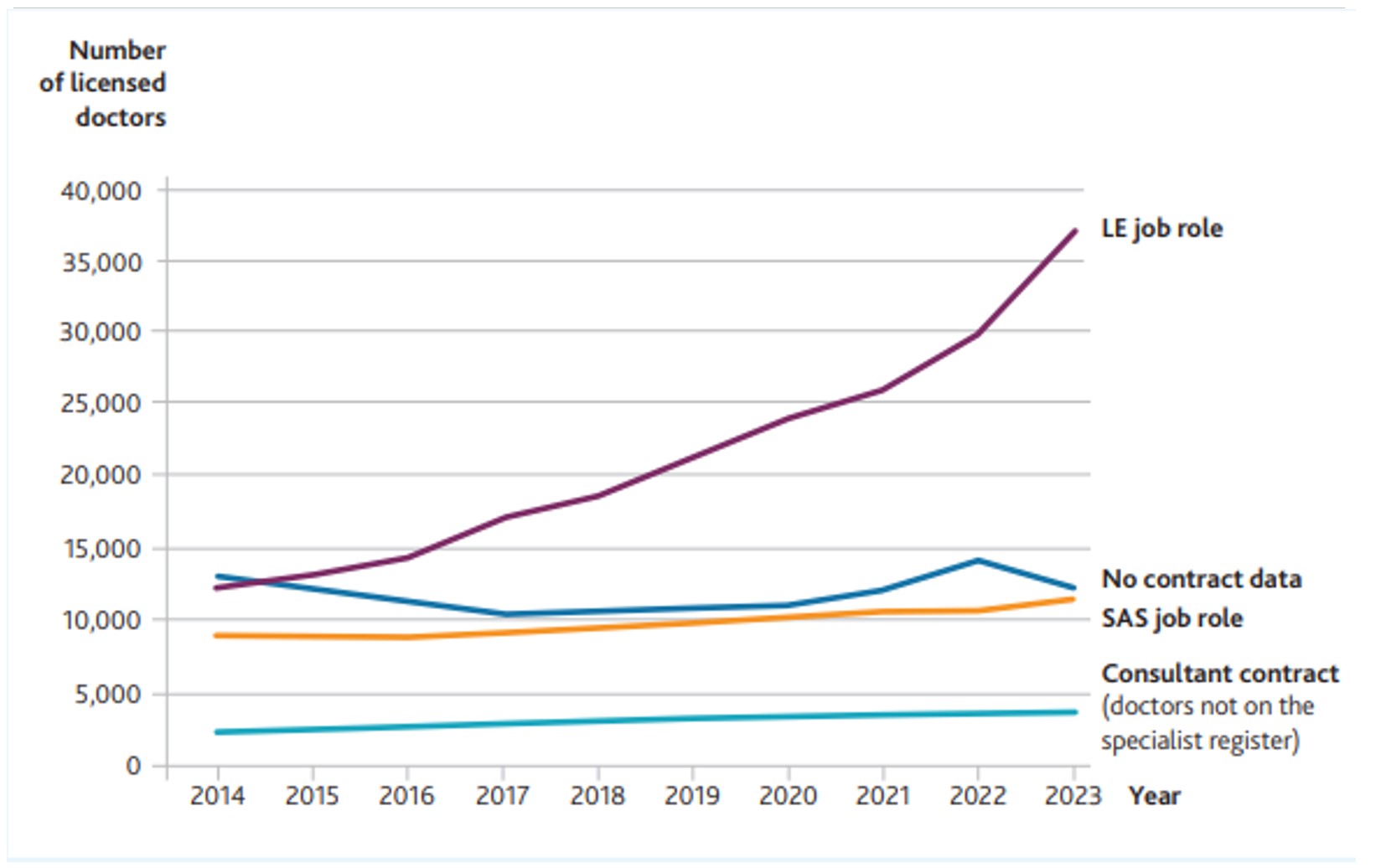 8. There has been a significant increase in the proportion of new joiners to the medical register attaining their primary medical qualification (PMQ) overseas (from 47% in 2017 to 68% in 2023) and they now represent 66% of those in locally employed doctor (LED) roles and 81% of those in specialist, associate specialist and specialty (SAS) roles (GMC Workforce report 2024).