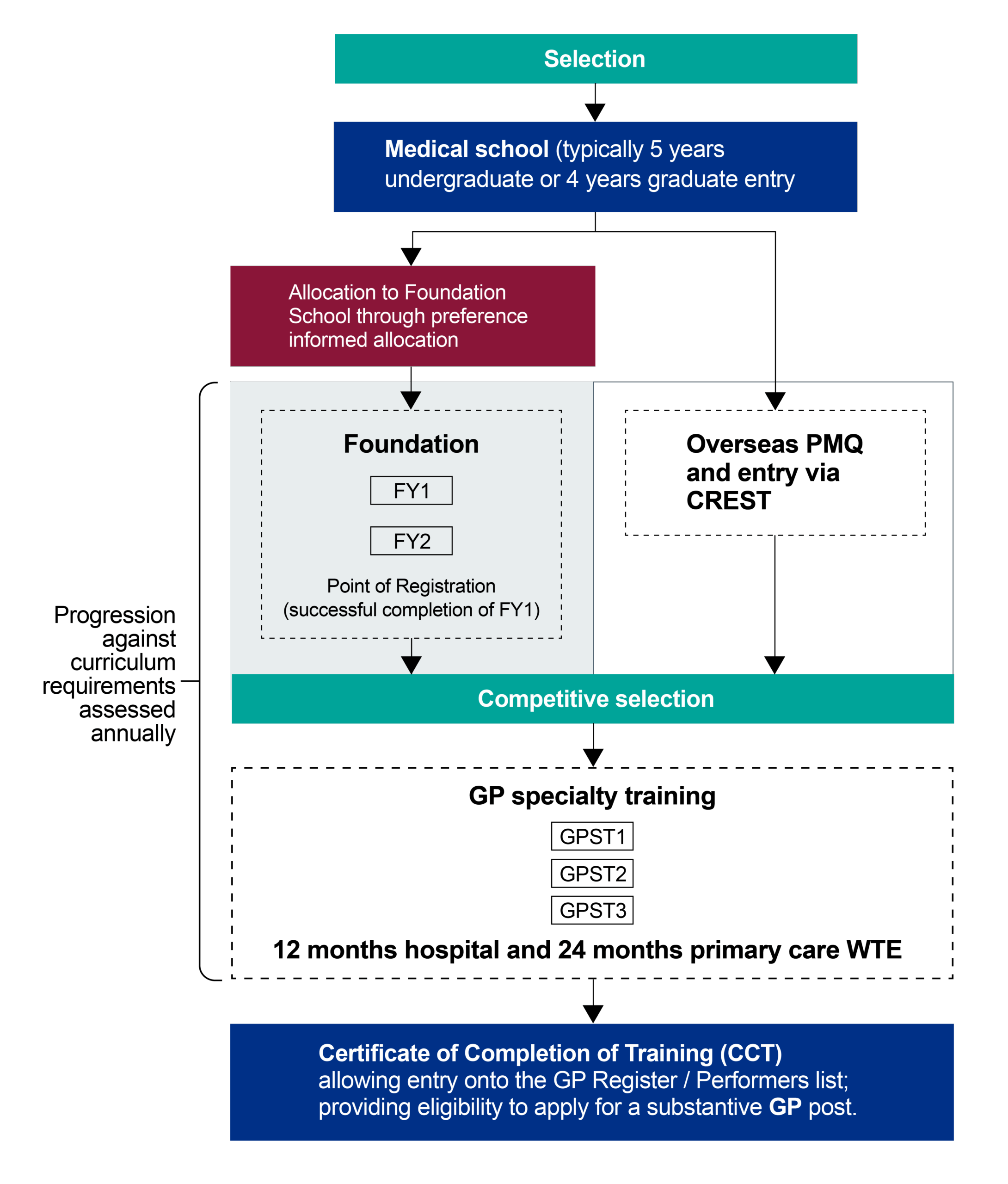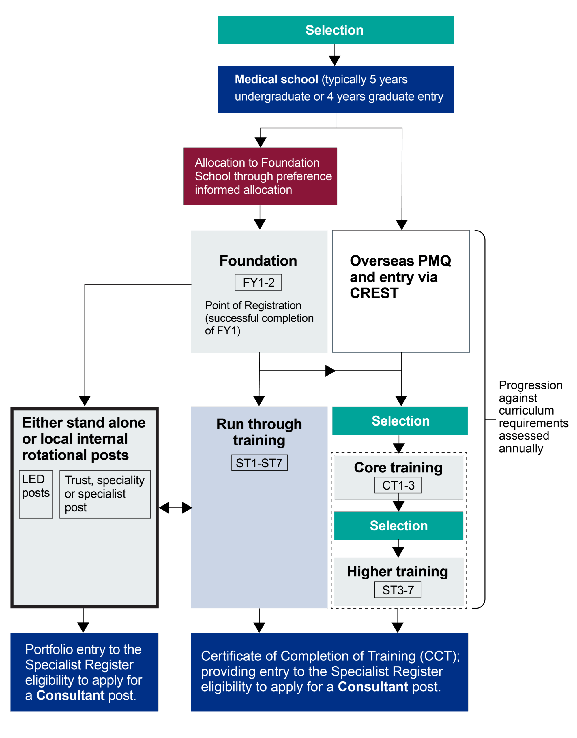 29. Postgraduate medical training is currently delivered through structured programmes that train in a stepwise progression from the point of qualification, through foundation and specialty programmes, to completion and entry onto the GMC Specialist Register or GP Register (Figures 2 and 3).