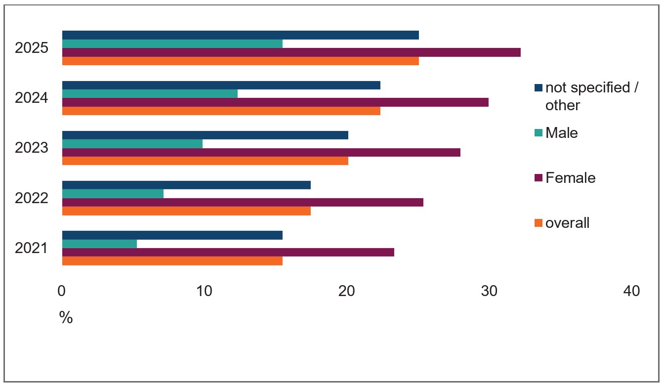 Figure 4: Proportion of resident doctors training less than full-time overall and by gender, 2021 to 2025 (source: NHS England data)
