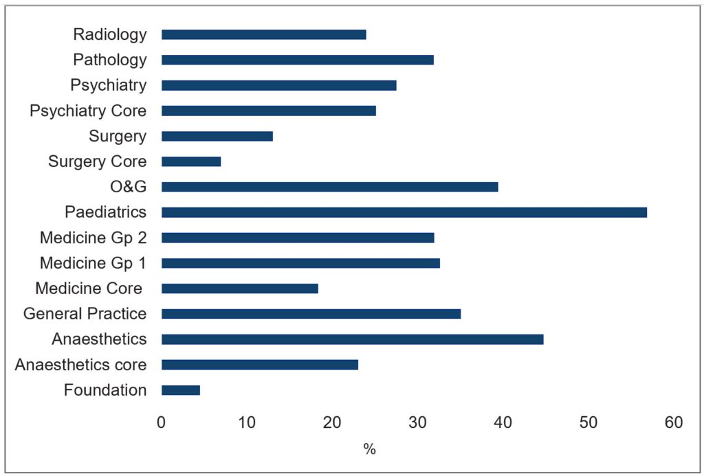 39. There is significant variation in the numbers training flexibly across specialties, with markedly fewer opting for this in foundation and surgical specialties, and significantly higher numbers in anaesthetics, paediatrics and obstetrics and gynaecology (Figure 5).