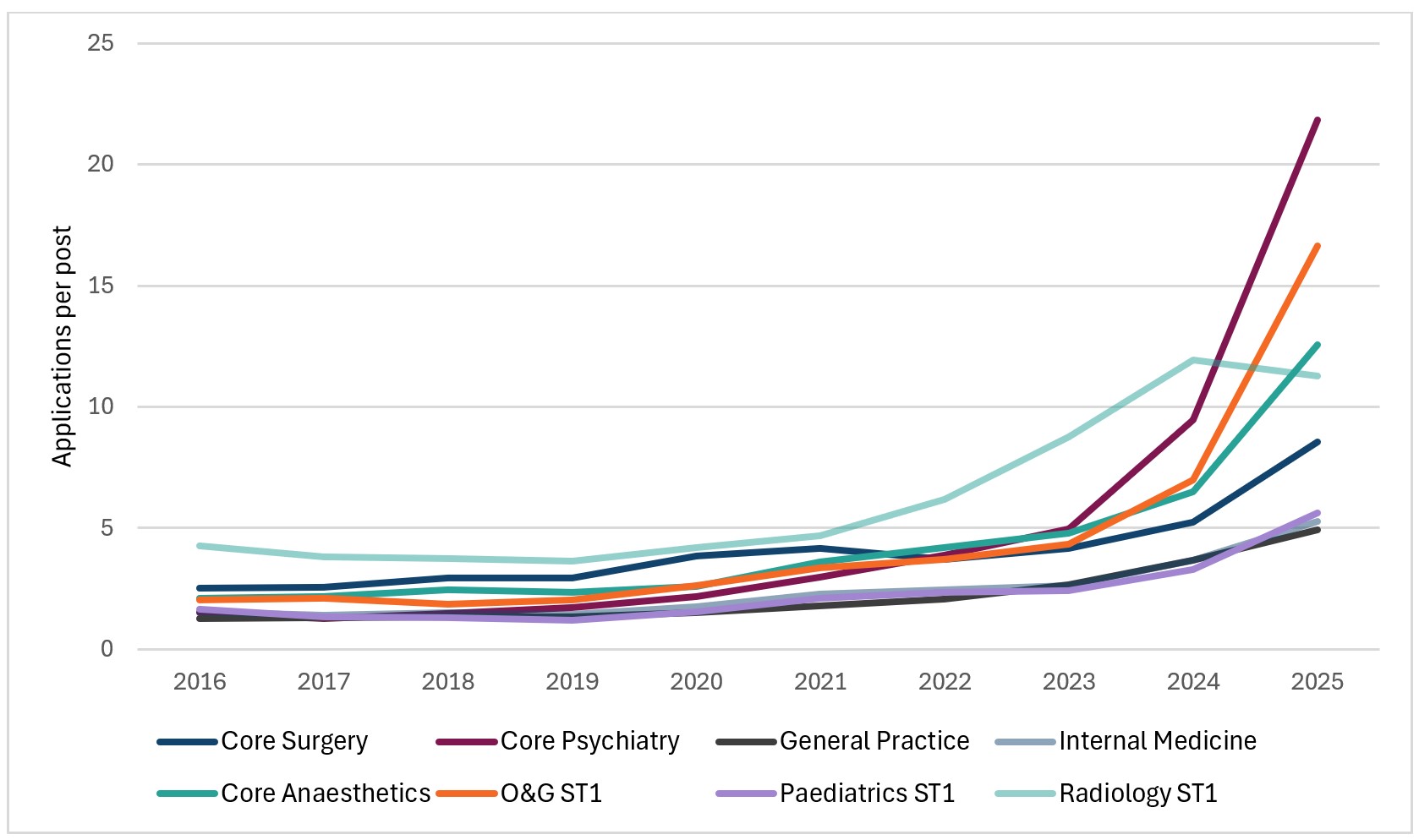 Figure 7: Core training competition ratios, 2016–2025 (source: NHS England data)