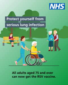 From 01 April 2026 the respiratory syncytial virus (RSV) vaccine will be available for free on the NHS to all adults aged 75 and over and anyone living in a care home for older adults. RSV is a major cause of lung infections like bronchitis and pneumonia. It is already available for pregnant women from 28 weeks of pregnancy to protect their babies from serious lung infection. Ask at your GP surgery for a vaccination, or check to see if you can get a vaccination at a pharmacy local to you https://www.nhs.uk/nhs-services/vaccination-and-booking-services/get-a-free-rsv-vaccination/