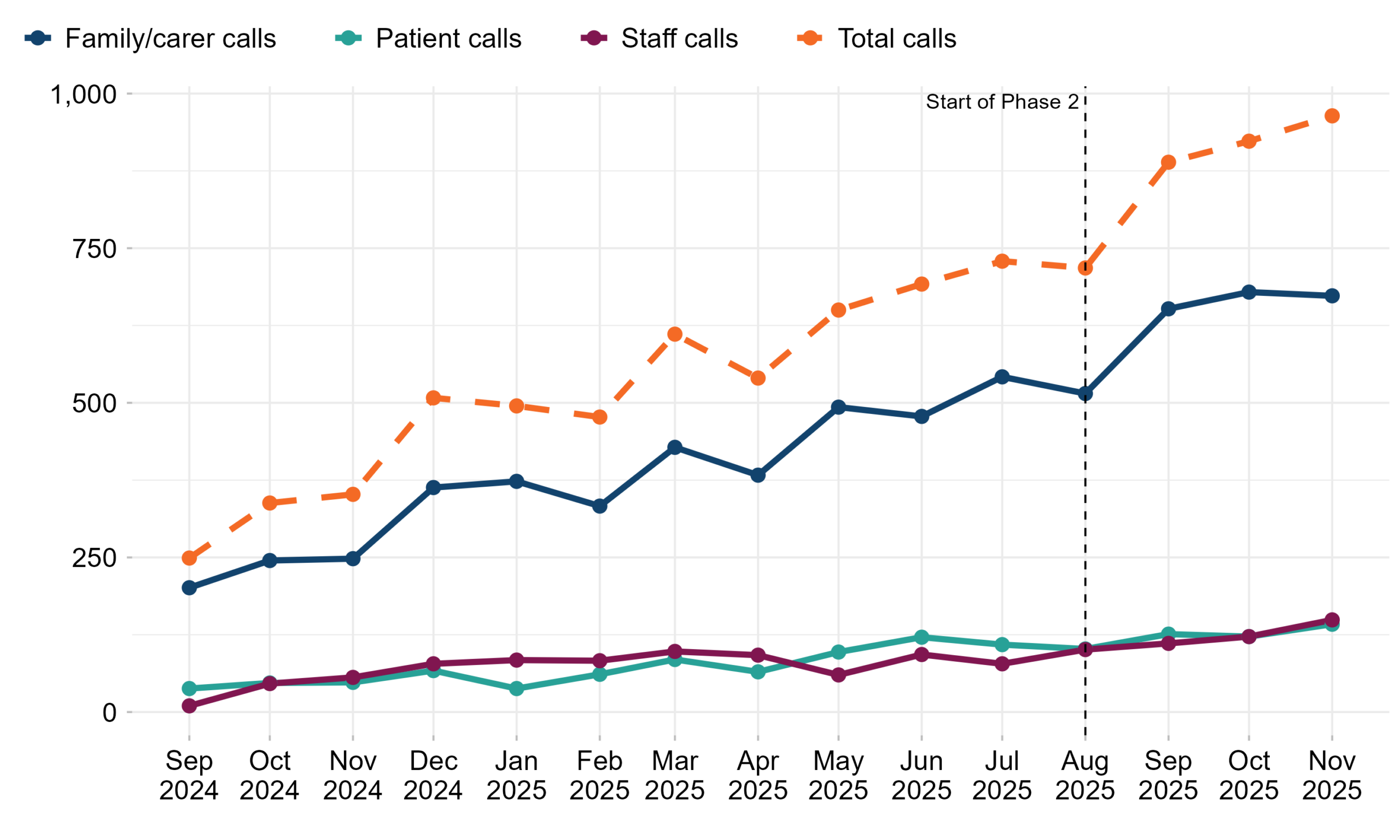 Table 3: Number of calls and number of sites per NHS England region. Phase 2 sites started reporting data from August 2025. Reporting period from September 2024 to November 2025.