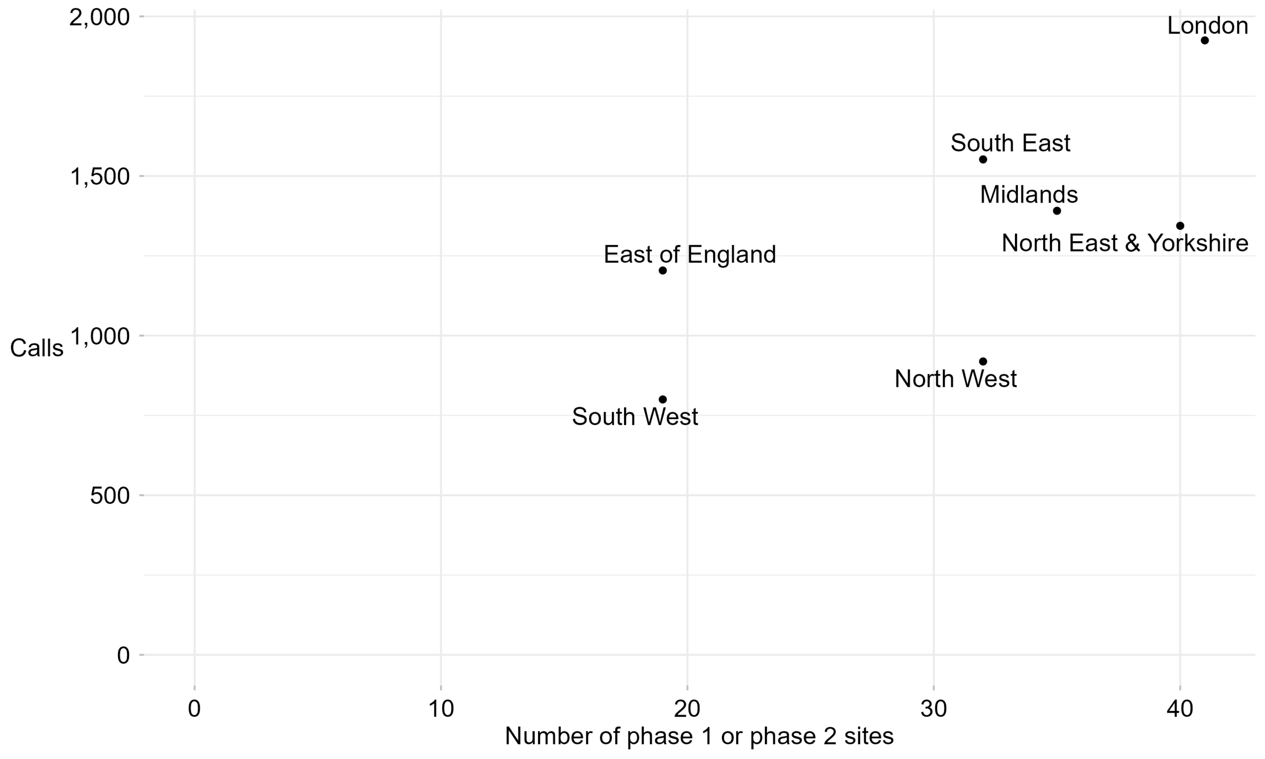 Figure 3: Number of calls and number of phase 1 or phase 2 sites per NHS England region. Phase 2 sites started reporting data from August 2025. This figure is an aggregate of phase 1 and phase 2 sites from September 2024 to November 2025.