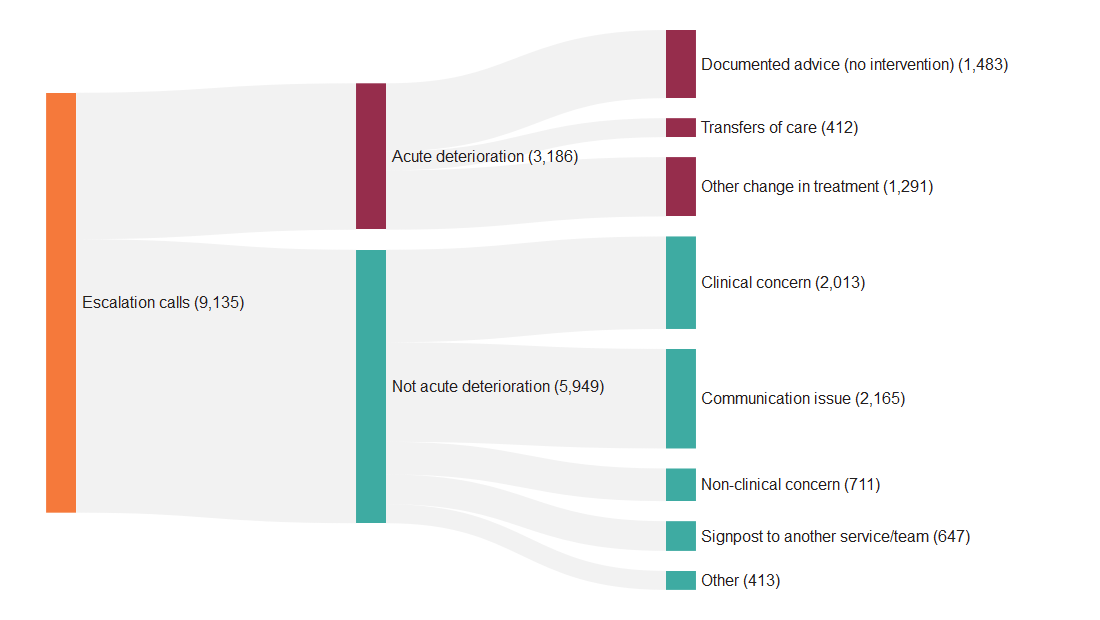Table 4: Flow of calls by escalation process and whether the call was related to acute deterioration. Reporting period from September 2024 to November 2025.