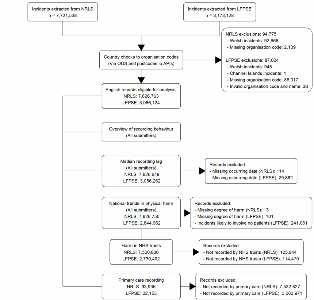 Additionally, we have removed incidents where the country of occurrence was unclear, either because no organisation code was attached to the incident, or because the code and name assigned did not allow inference of the country accurately. In NRLS, there were 2,109 incidents missing an organisation code, whereas in LFPSE there were 86,017 incidents missing both an occurring and a recording organisation code; this is a known data quality issue that we are working on resolving. Furthermore, 38 LFPSE incidents were excluded because it was not possible to determine in which country the incident occurred based on the code and name associated with the record. These exclusions comprised 1.2% of all NRLS and 2.7% of all LFPSE data recorded between January 2021 to December 2024.