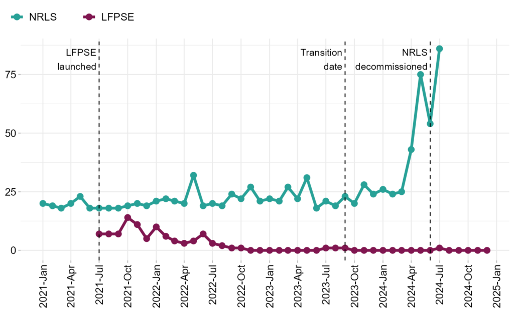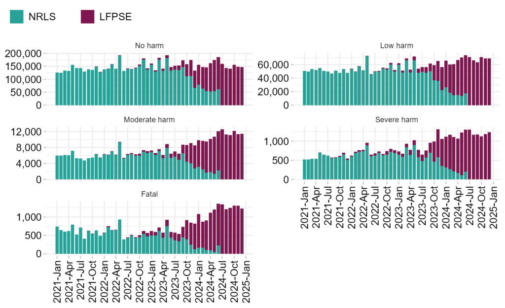 This plot illustrates the transition of patient safety incident recording from NRLS to LFPSE. Based on incidents occurring in England and recorded between January 2021 to December 2024.