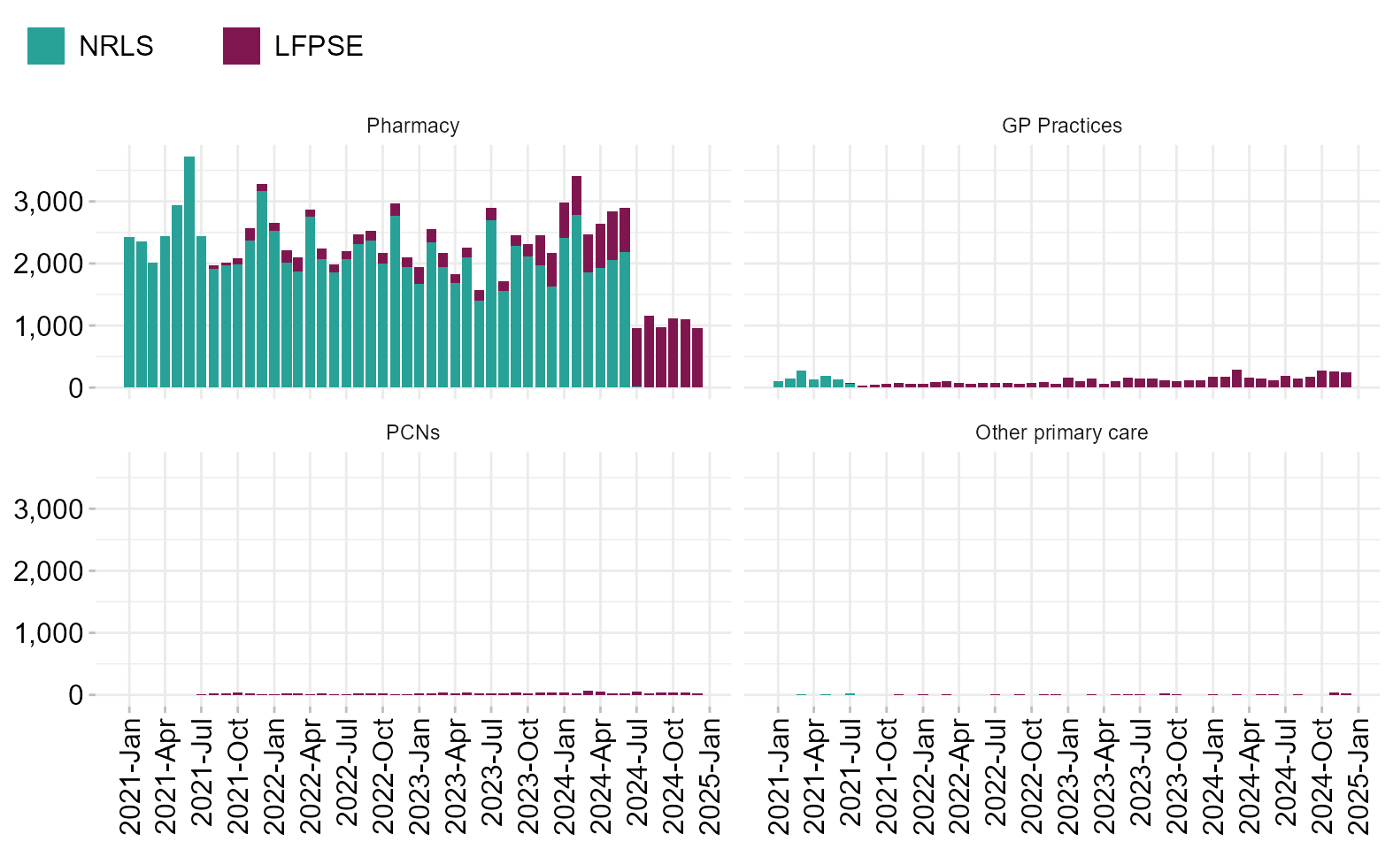 Note: ‘Other primary care’ is a category assigned to an organisation by LFPSE and its broad nature requires further validation. We will likely break this category down in the future, after checking organisation codes in this group using NHS England’s Organisation Data Service (ODS), as we have done for pharmacies, GP practices, and PCNs.