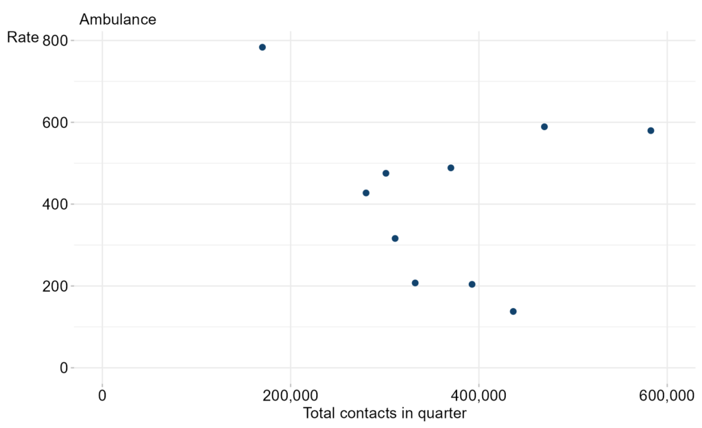 Figure 8: Incident recording rate (per 100,000 ambulance contacts) versus total ambulance contacts in the quarter, per NHS trust