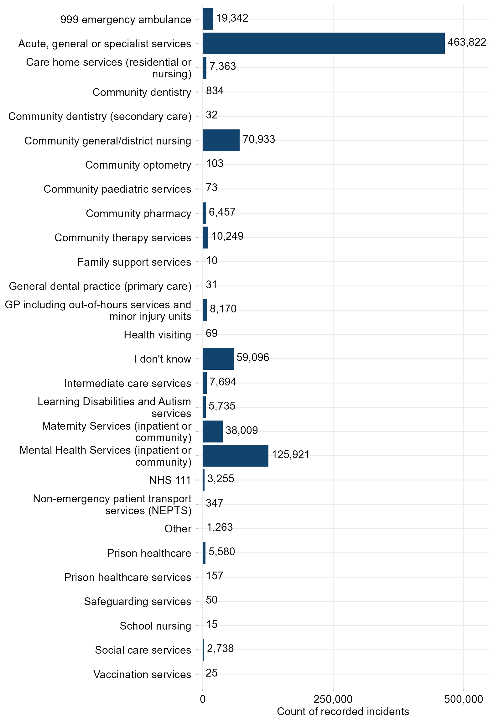 The service area variable can contain multiple responses if the incident occurred in more than one area. As a result, some incidents will be counted more than once, so the figures here cannot be totalled without double-counting records. 807,945 incidents recorded a service area this quarter. The majority of these (57.4%) were recorded under acute, general or specialist services. The remaining were spread primarily across mental health, community, and maternity services. A further 1,158 records did not contain a value for service area and are subsequently missing.