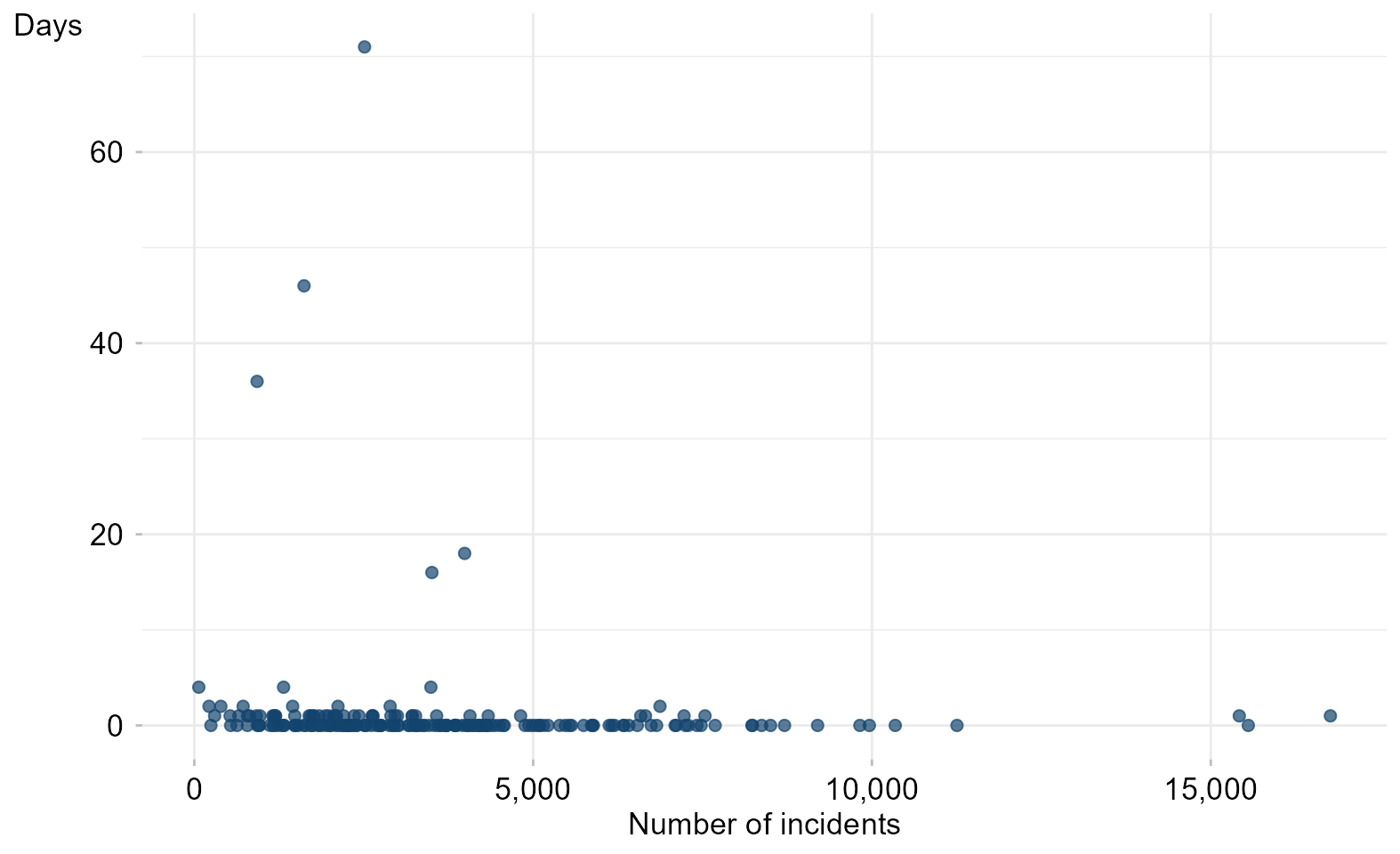 Figure 3: Median recording lag (in days) versus total number of incidents recorded, per NHS trust