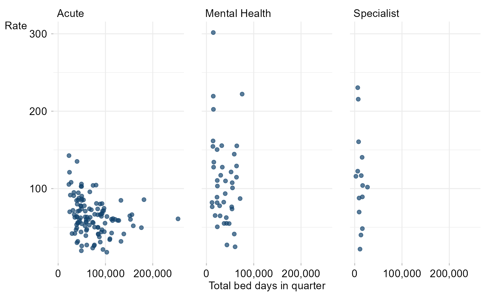 Figure 4: Incident recording rate (per 1,000 bed days) versus total bed days in the quarter, per NHS trust