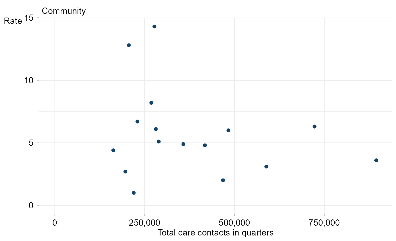 Figure 5: Incident recording rate (per 1,000 care contacts) versus total care contacts in the quarter, per NHS trust