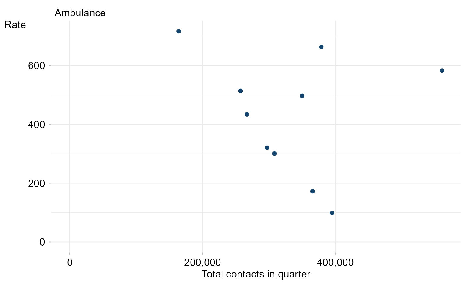 Figure 6: Incident recording rate (per 100,000 ambulance contacts) versus total ambulance contacts in the quarter, per NHS trust