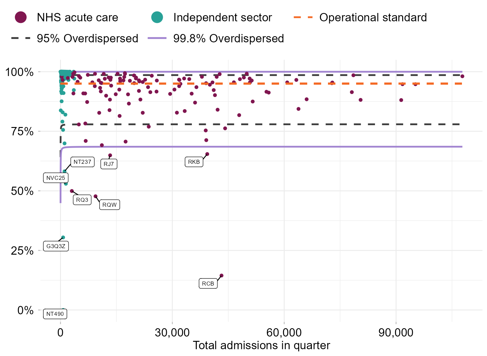 Figure 7 is a funnel plot of the total admissions for each provider in the quarter against the percentage of total admissions risk assessed for VTE. The funnel plot limits have been adjusted for overdispersion. Providers that fall below the 99.8% overdispersed lower limit have been labelled in figure 7 and listed in table 7.